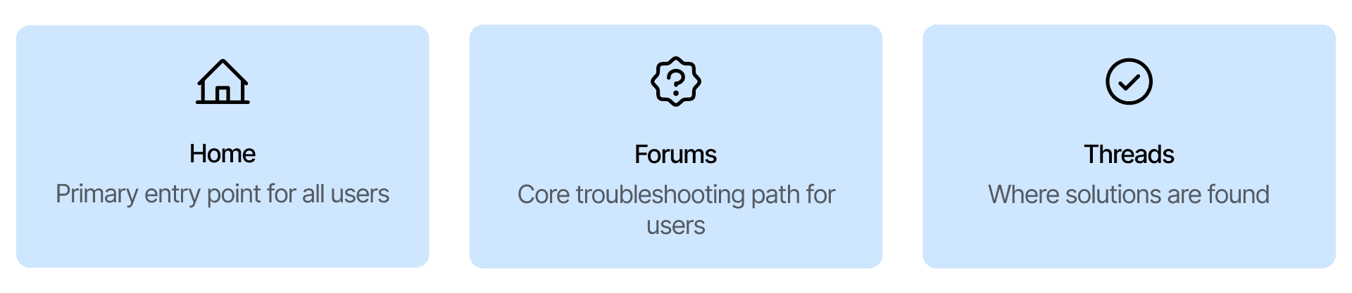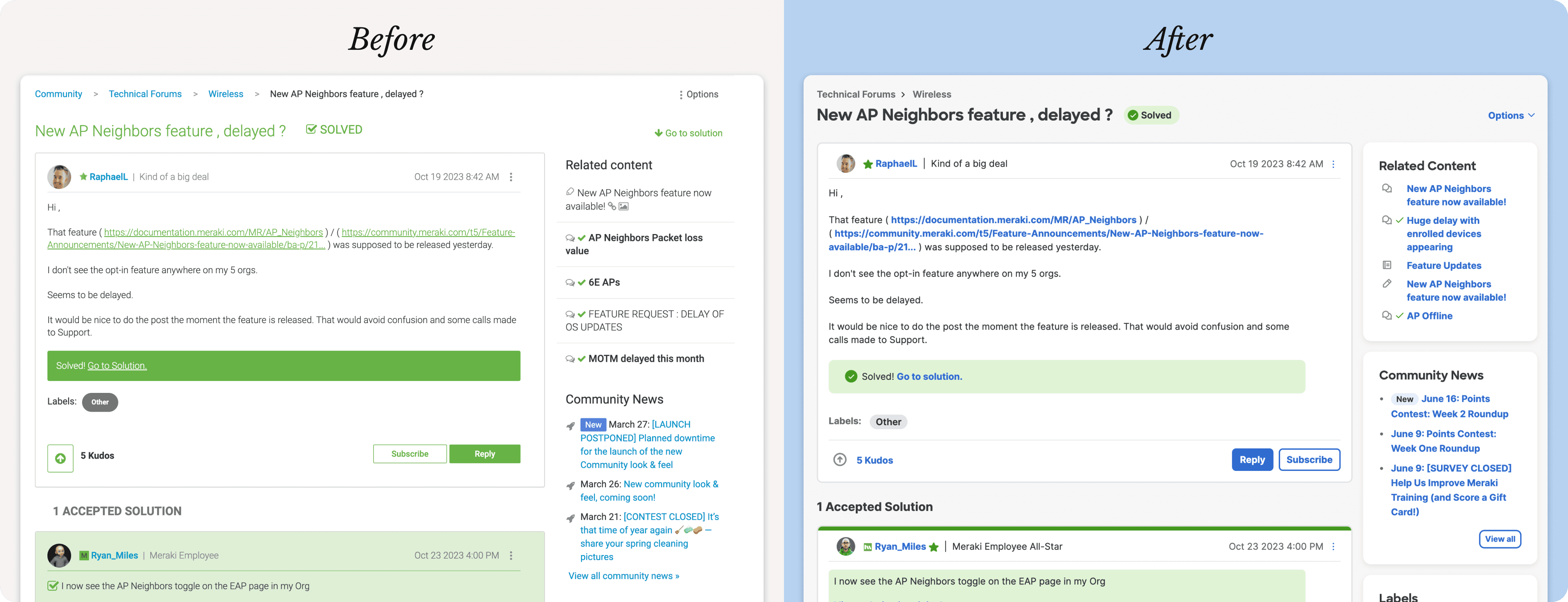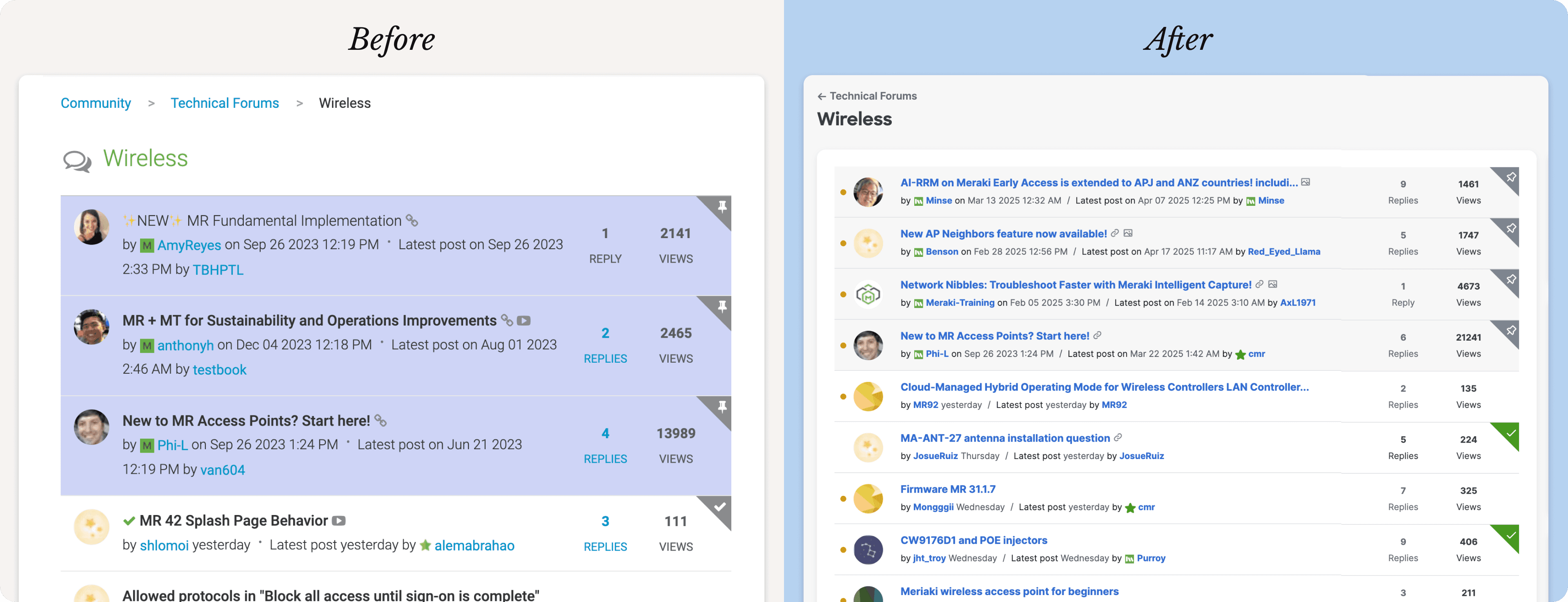 Most users didn't know they could jump between forums and groups. I added a new navigation menu and restructured the IA to match the product order users already knew from the Meraki dashboard, making navigation feel familiar without requiring them to relearn anything.