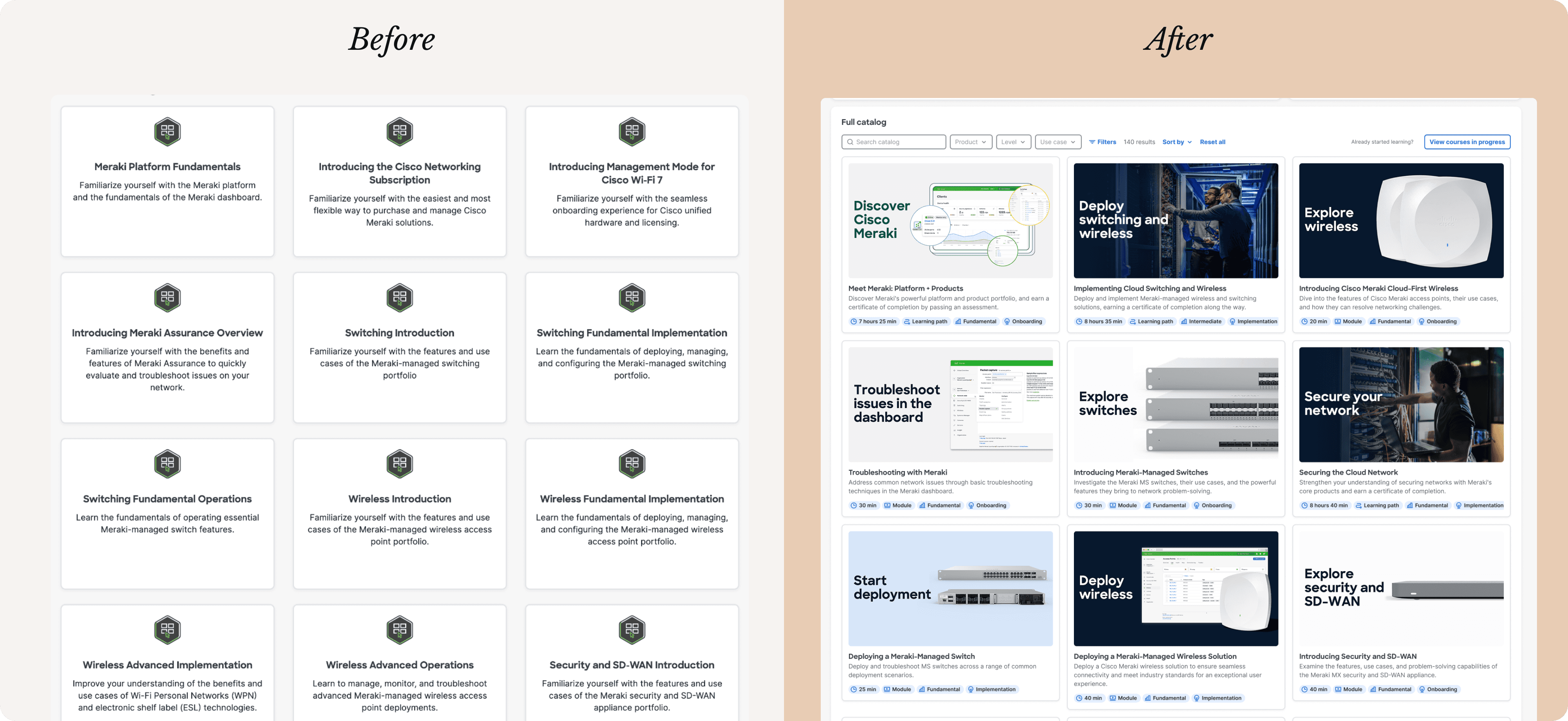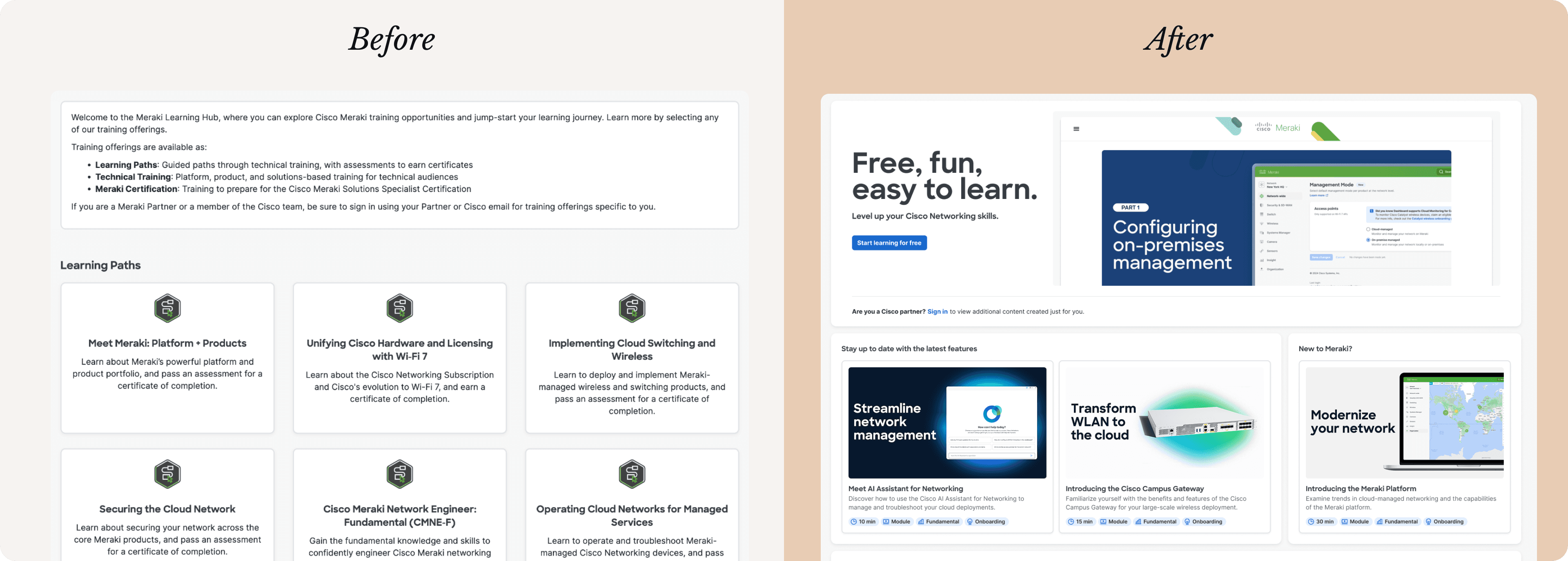 For new and returning users, featuring relevant content upfront reduced decision fatigue for those browsing: a New to Meraki on-ramp for beginners and new topics for advanced.